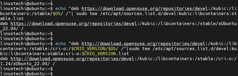 $ echo "deb http://download.opensuse.org/repositories/devel:/kubic:/libcontainers:/stable:/cri-o:/$CRIO_VERSION/$OS/ /"|sudo tee /etc/apt/sources.list.d/devel:kubic:libcontainers:stable:cri-o:$CRIO_VERSION.list