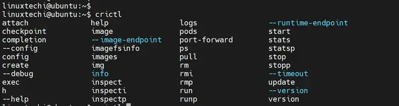 要使用自动补全功能,你需要注销或启动新的终端会话。然后只需键入 crictl 命令并按 TAB 键即可查看所有选项。