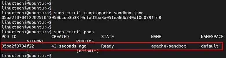 $ sudo crictl runp apache_sandbox.json