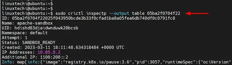 $ sudo crictl inspectp --output table 05ba2f0704f22
