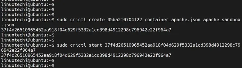 $ sudo crictl create 05ba2f0704f22 container_apache.json apache_sandbox.json