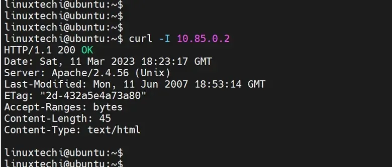 要验证 Apache Web 服务器是否正在运行,请使用 curl 命令和容器荚的内部 ID 向 Web 服务器发送 HTTP 请求:
