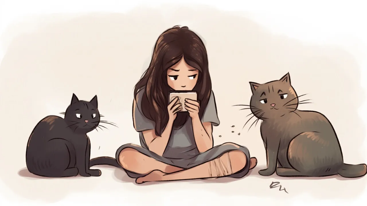 (题图:MJ:A girl looks at her phone while two cats are peeking at her phone next to her.)