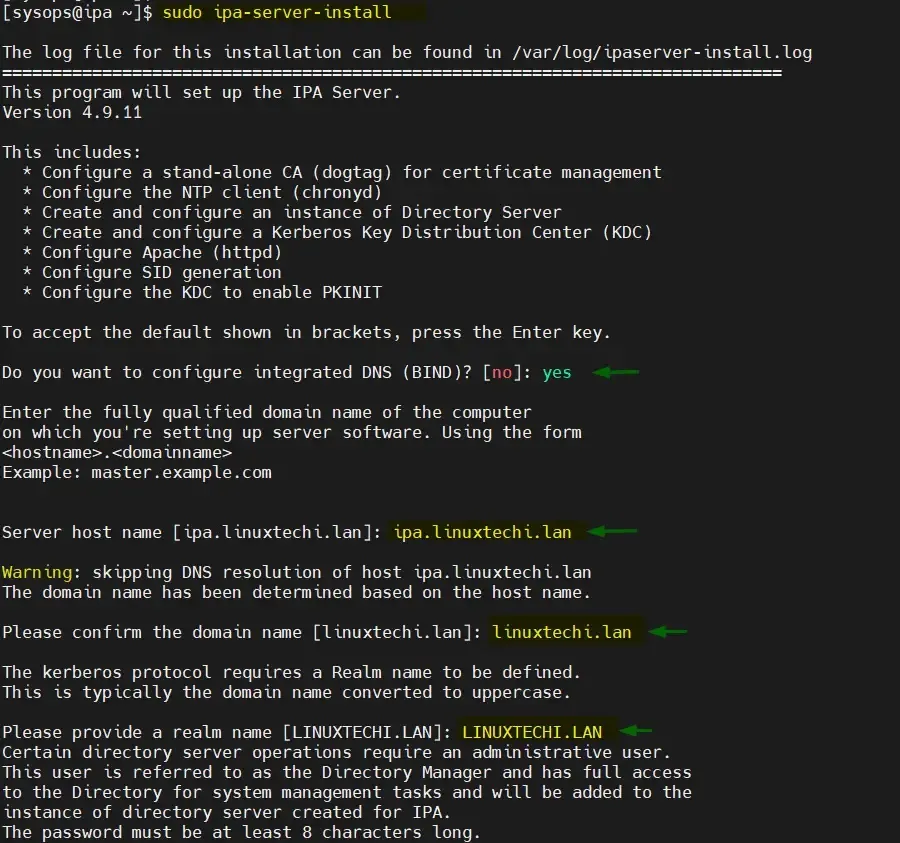 成功安装 FreeIPA 包及其依赖项后,使用以下命令启动 FreeIPA 安装设置。