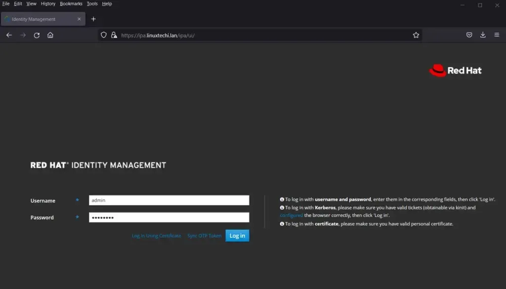完美,上面的输出确认管理员获得了令牌。现在,尝试访问 FreeIPA Web 控制台,在网络浏览器上输入以下 URL: