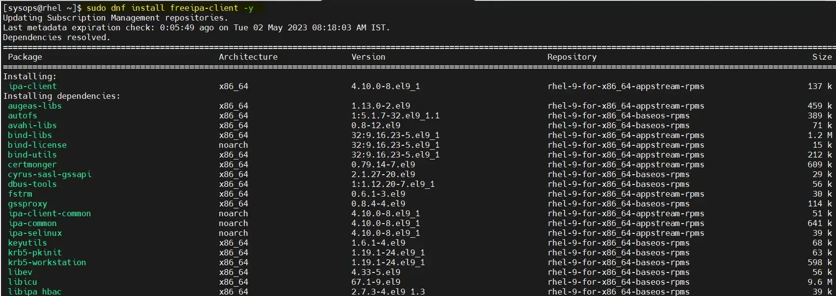 FreeIPA 客户端及其依赖项在默认软件包仓库(AppStream 和 BaseOS)中可用,因此要安装 FreeIPA 客户端,请运行: