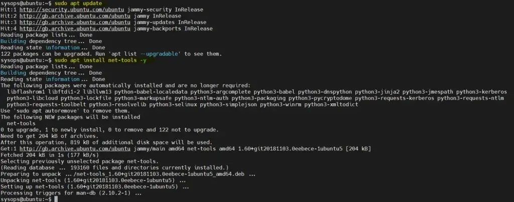 例如,你可以更新本地包索引,然后安装 net-tools 包:
