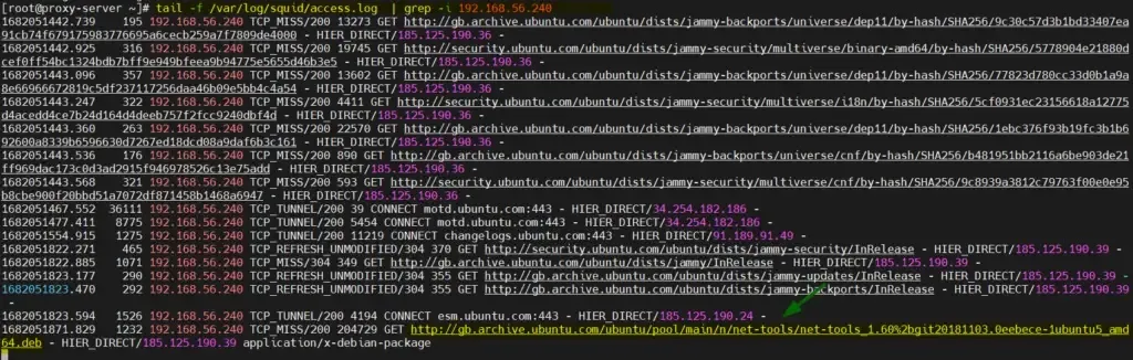 # tail -f /var/log/squid/access.log | grep -i 192.168.56.240