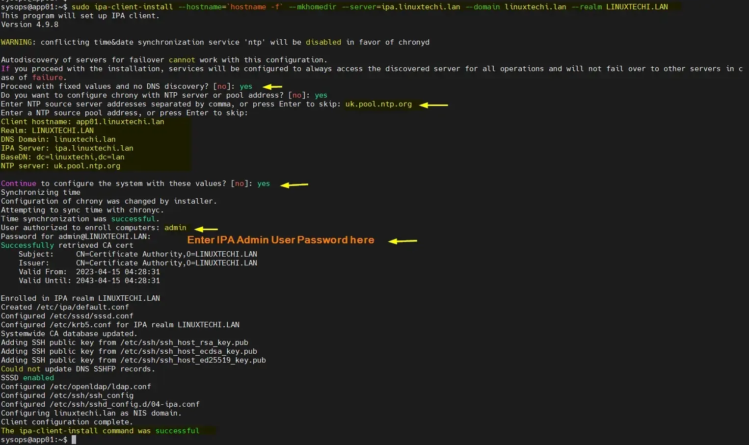 $ sudo ipa-client-install --hostname=`hostname -f` --mkhomedir --server=ipa.linuxtechi.lan --domain linuxtechi.lan --realm LINUXTECHI.LAN
