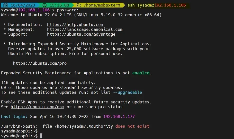 $ ssh sysadm@192.168.1.106
