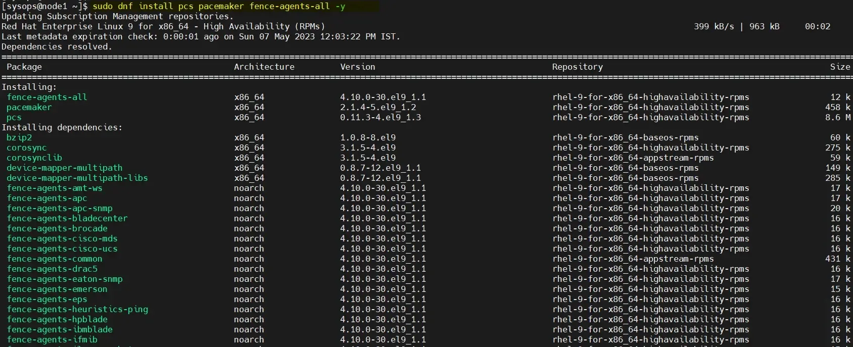 $ sudo subscription-manager repos --enable=rhel-9-for-x86_64-highavailability-rpms
