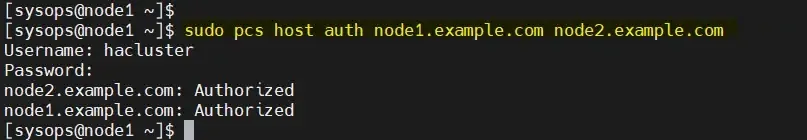 $ sudo pcs host auth node1.example.com node2.example.com