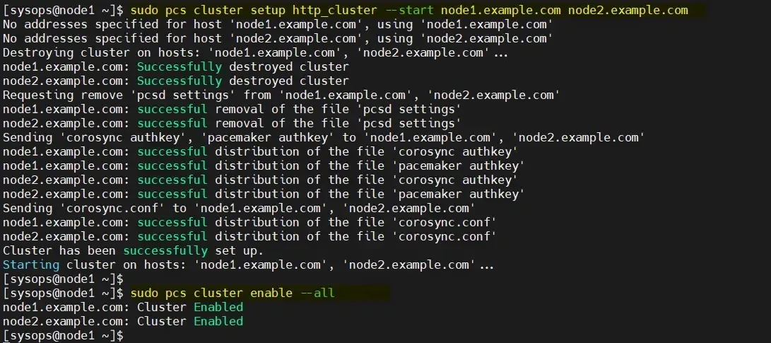 $ sudo pcs cluster setup http_cluster --start node1.example.com node2.example.com