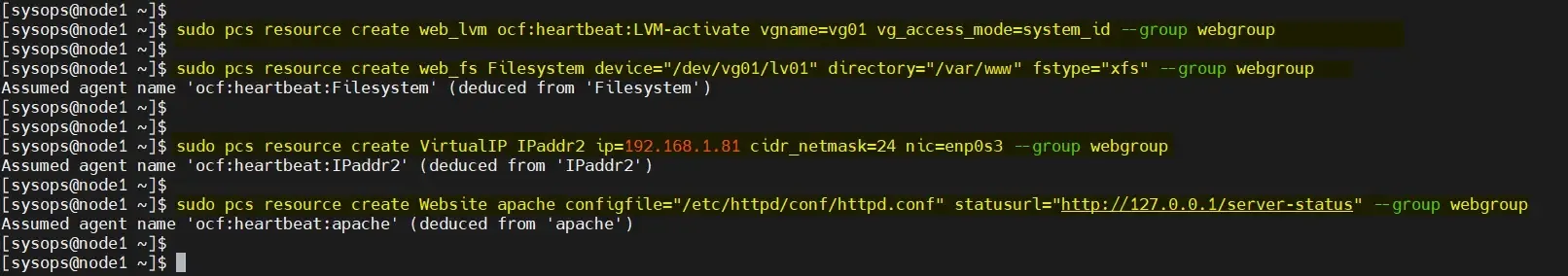 $ sudo pcs resource create VirtualIP IPaddr2 ip=192.168.1.81 cidr_netmask=24 nic=enp0s3 --group webgroup