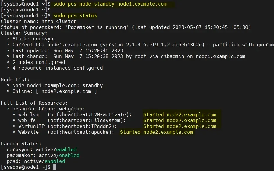 $ sudo pcs node standby node1.example.com