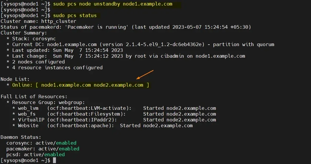 $ sudo pcs node unstandby node1.example.com
