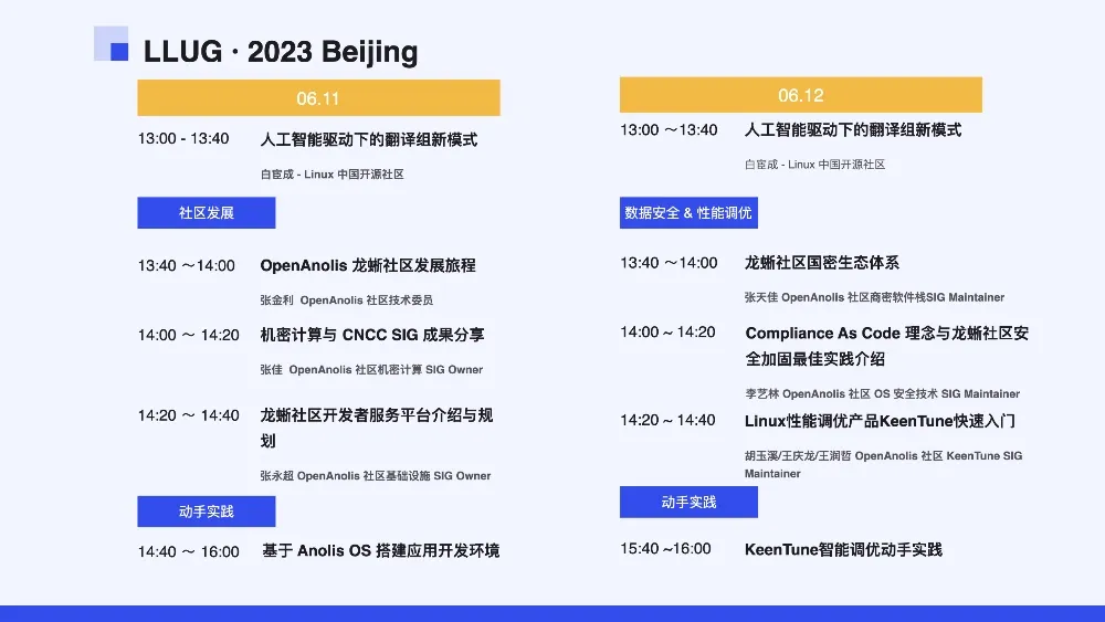 我们将在 LLUG 2023 北京场和各位分享 Linux 中国在生成式 AI 上的新实践,以及我们对于通过开源推动 Linux 中国翻译组的持续发展的一些想法和探索。此外,我们还邀请到了 OpenAnolis社区的几位大咖来给大家分享他们在技术前沿的经验和总结。