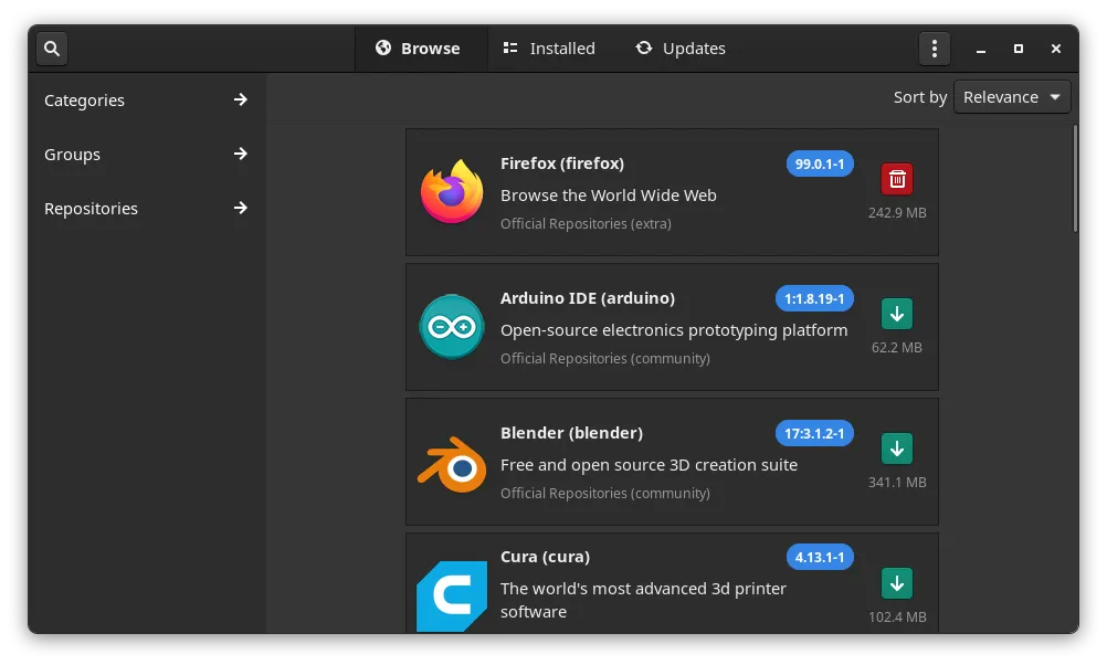在 Manjaro Linux 中,我发现安装了 Pamac 作为包管理器。这似乎是 在 Manjaro Linux 上安装和卸载软件的最佳方式之一。