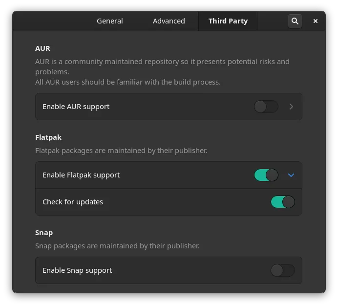 总体来说,体验非常流畅,没有出现任何麻烦。为了提升体验,包管理器还可以通过调整 pamac 的偏好设置,快速启用对 Flatpaks/Snaps/AUR 的支持。