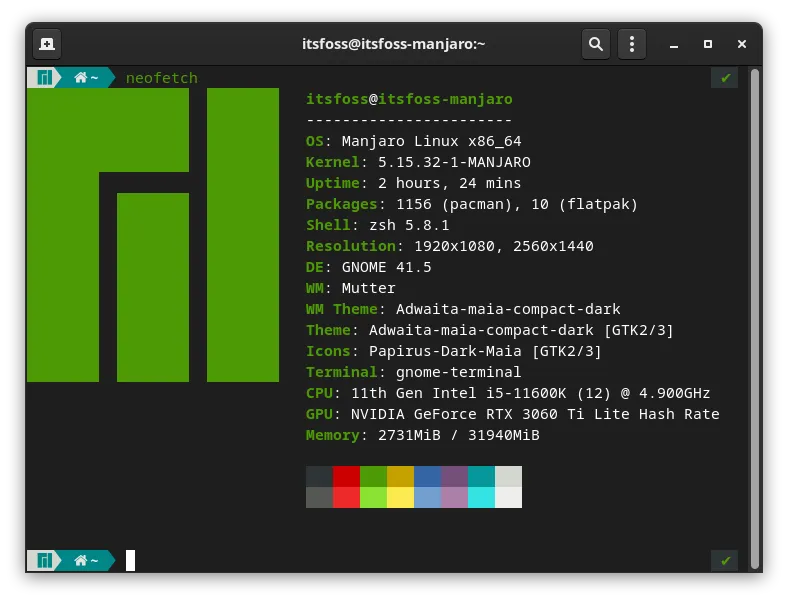 换句话说,我可以直接尝试不同的东西。令我兴奋的是,终端提示符和遵循 Manjaro 品牌的Shell(或终端)的主题也采用了 Manjaro 的强调色,非常令人印象深刻!
