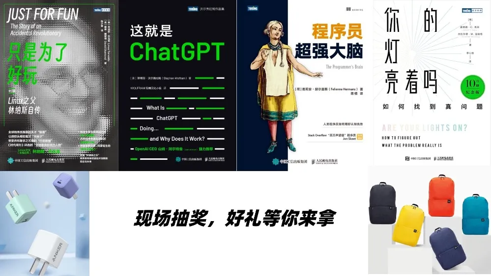 我们将会在活动现场举办线下抽奖,如果来到现场,别忘了参与互动,进行线下的抽奖哦~我们为大家准备了技术图书、小米背包、充电头等精选好物,期待在现场见到你哦~