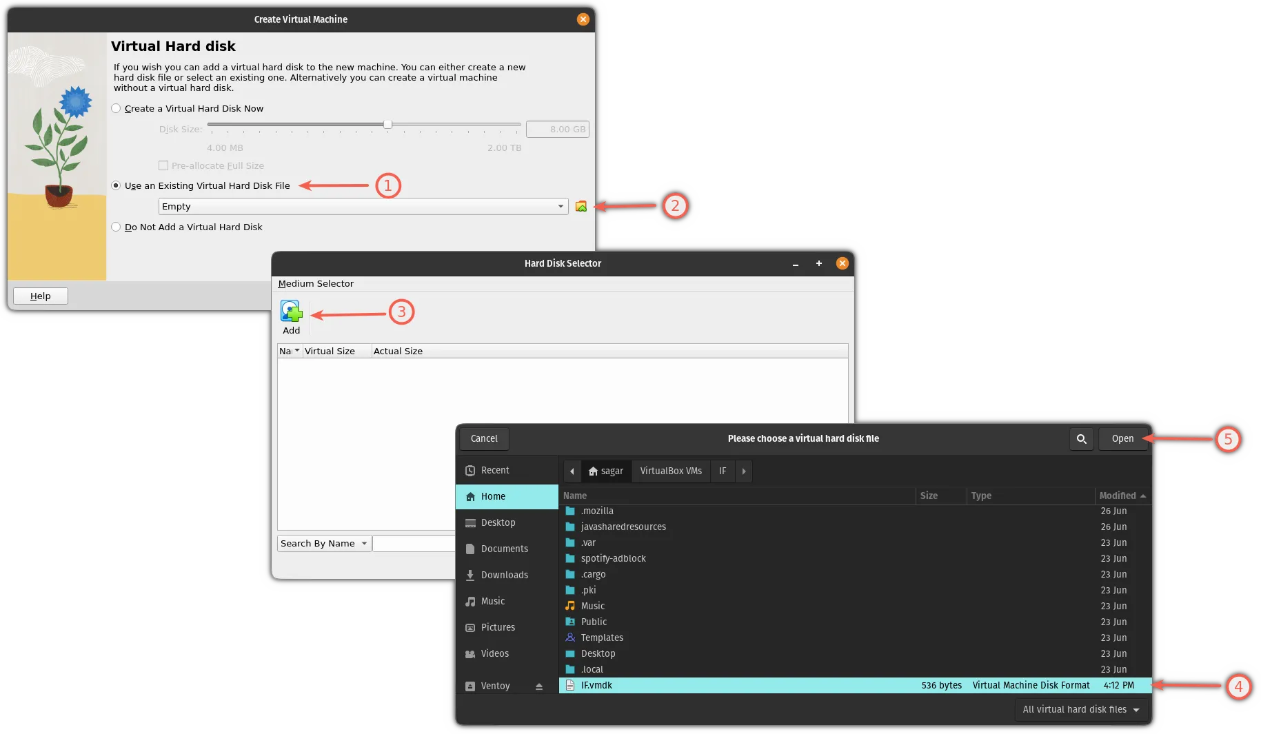 在这里,你将找到创建或添加虚拟磁盘的选项。现在,请执行 3 个简单步骤: