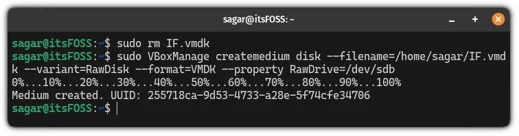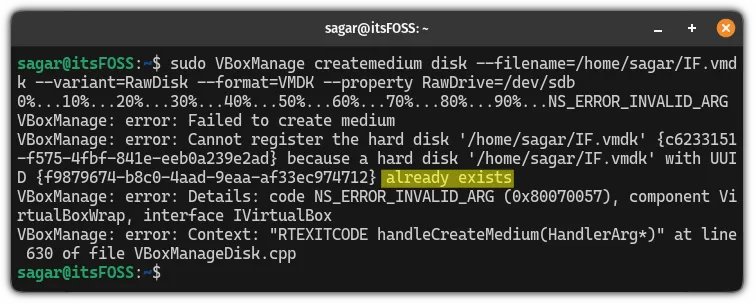 sudo VBoxManage createmedium disk --filename=/home/sagar/IF.vmdk --variant=RawDisk --format=VMDK --property RawDrive=/dev/sdb