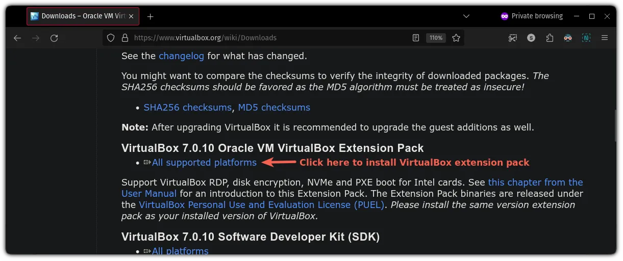 要安装 VirtualBox 扩展包,只需访问 VirtualBox 官方下载页面,向下滚动一点,你将找到下载扩展包的选项: