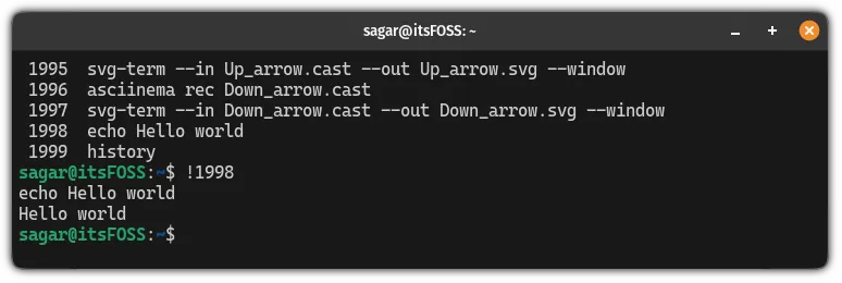 现在,假设我想要执行倒数第二个 echo 命令,我会这样使用: