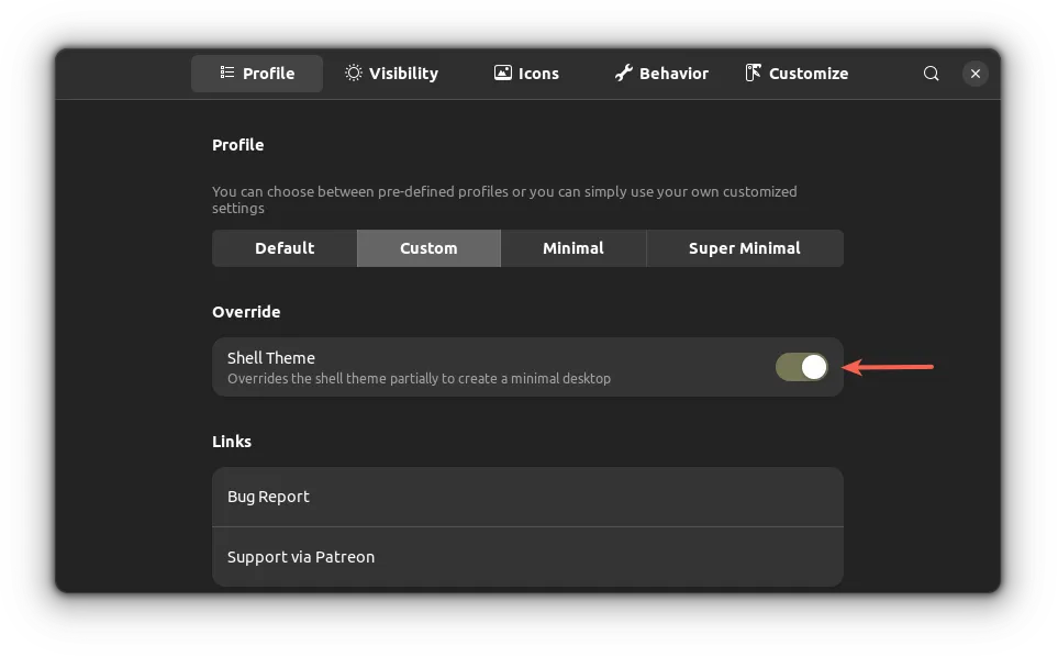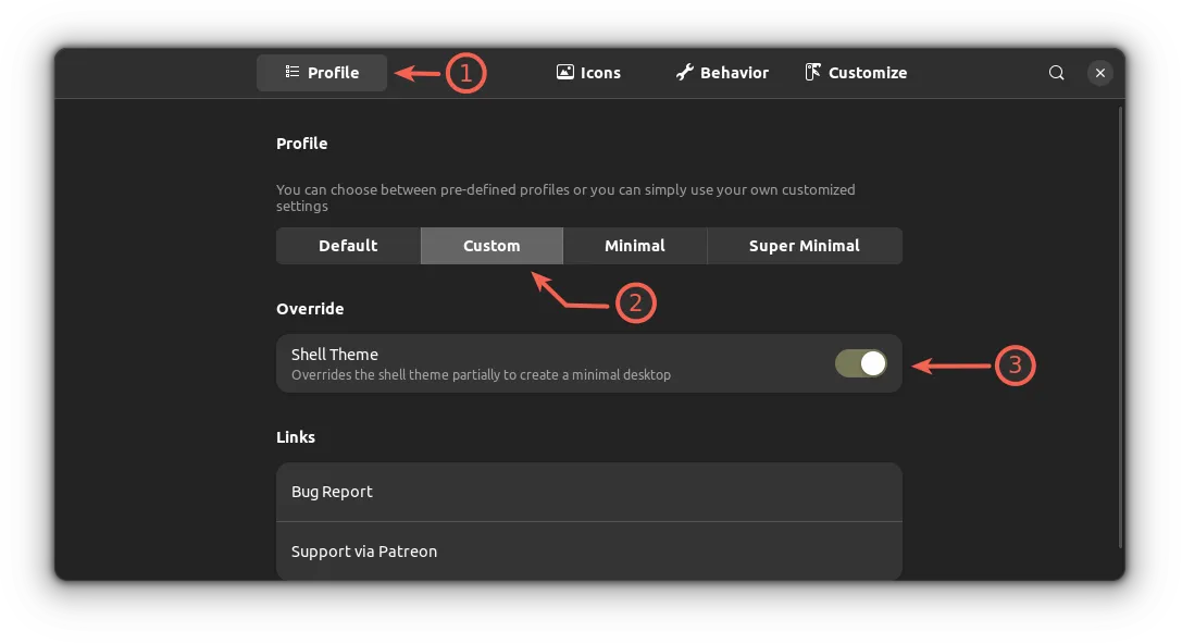要实现透明的停靠区,你需要在 “ 用户配置 Profile ” 菜单中选取 Custom 配置文件,并启用 “ Shell 主题 Shell Theme ” 选项即可: