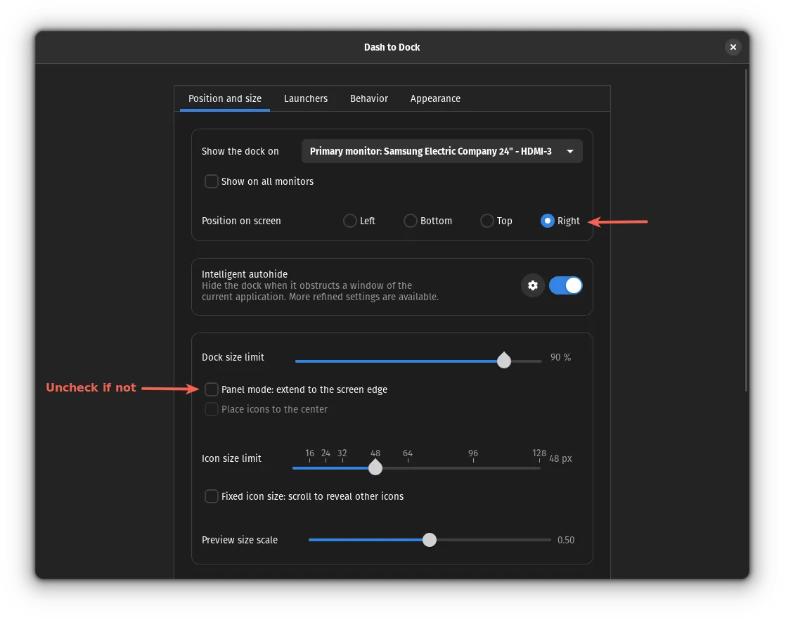 首先,在系统菜单中打开设置,然后进入 “ 外观 Appearance ” 菜单。在 “ 停靠区 Dock ” 部分,你会找到 “ 在屏幕上的位置 Position on screen ” 选项。