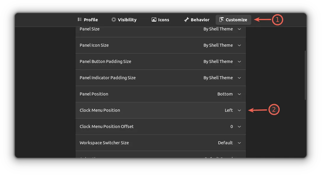要更改时钟位置,进入 “定制” 菜单,然后找到 “ 时钟菜单位置 Clock Menu Position ” 选项,选择 “ 左侧 Left ”: