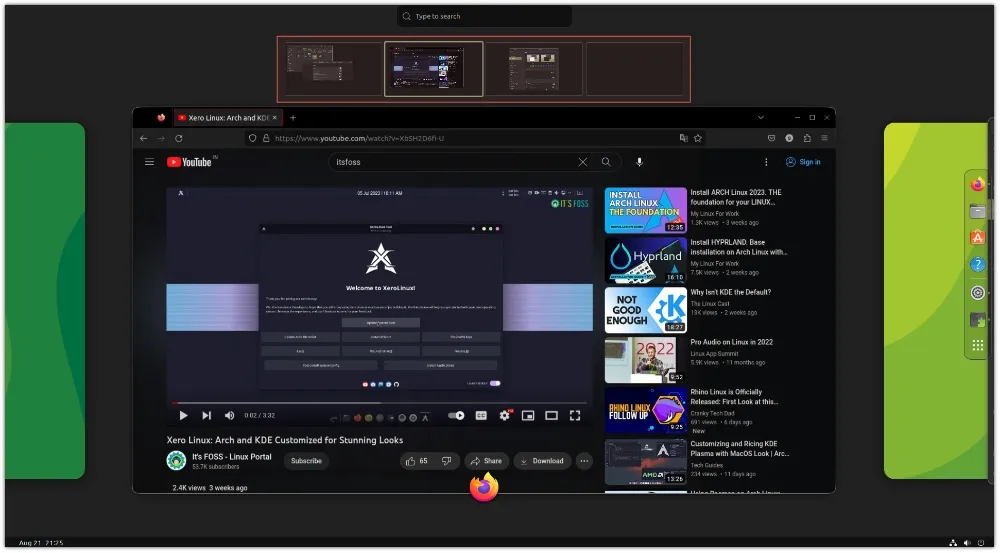 当你在预览多个工作区的活动时,工作区切换器可以显示每个工作区的预览。