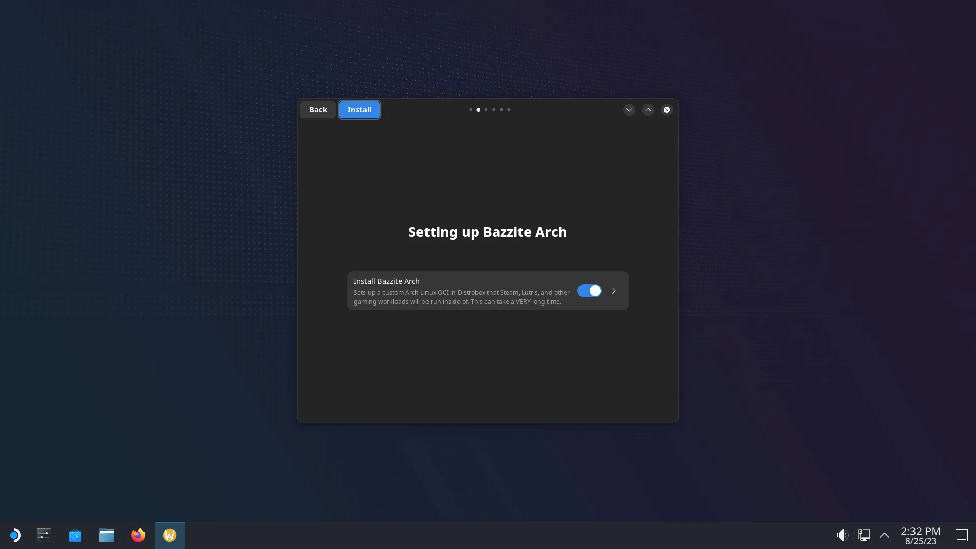 首先,它设置了 Bazzite Arch,它是一个自定义的 Arch Linux OCI,运行在 Distrobox 中,支持 Steam、Lutris 等在其内运行游戏。