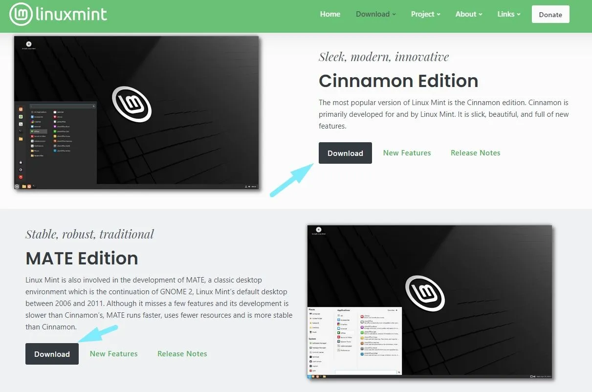 这些 ISO 文件包括了你可以找到 最佳的桌面环境。Cinnamon 是最流行的版本,建议选择它以获得最佳的 Linux Mint 体验,但你也可以尝试其他版本。