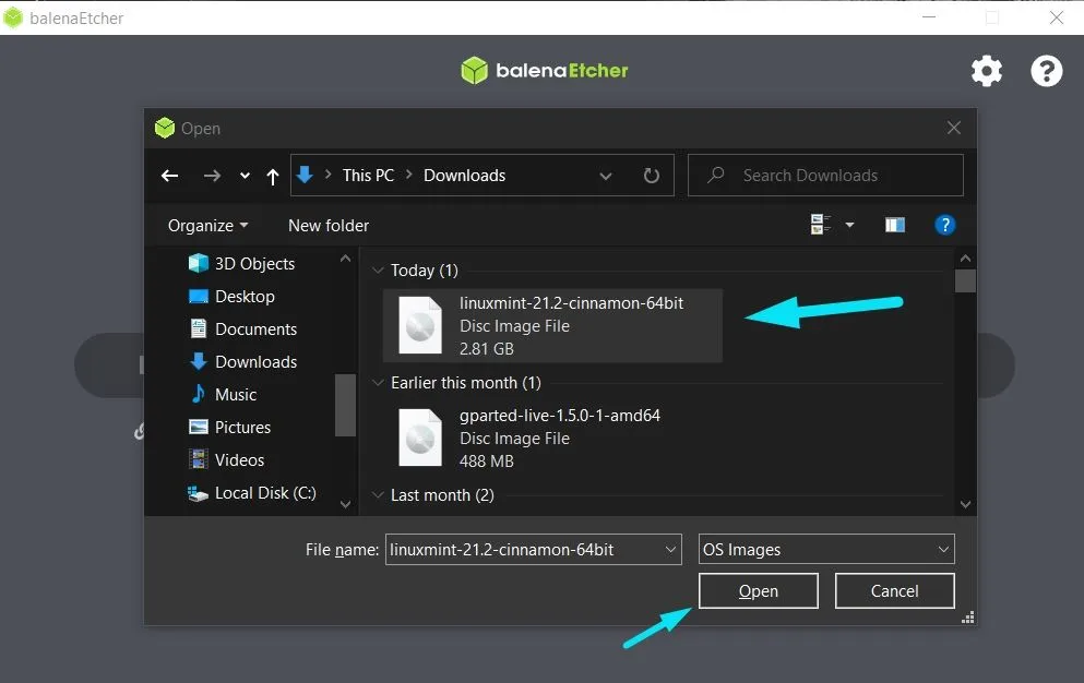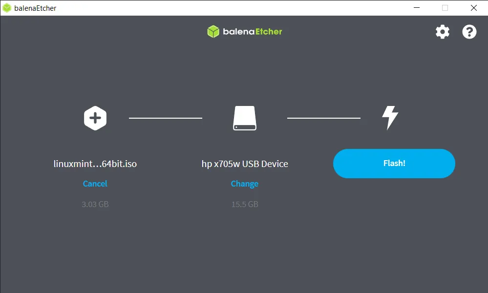第三步:使用 Etcher 将 Linux Mint ISO 写入到 USB 驱动器