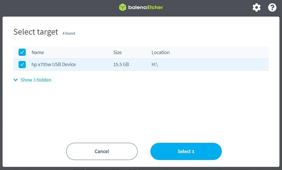 选择 ISO 文件后,需要选择要将要刷入的 USB 驱动器。如果只有一个,Etcher 会自动选择。但仍要确保在 Etcher 中选择了正确的 USB 驱动器。
