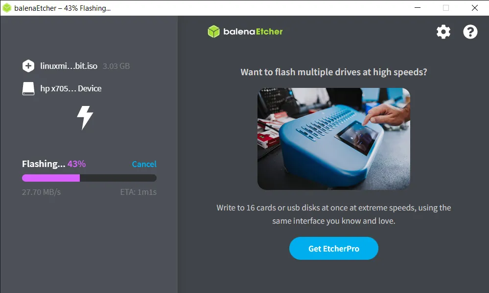 获得 ISO 文件后,你需要一个专用工具将 ISO 映像写入到 USB 驱动器上。我推荐使用 Etcher。
