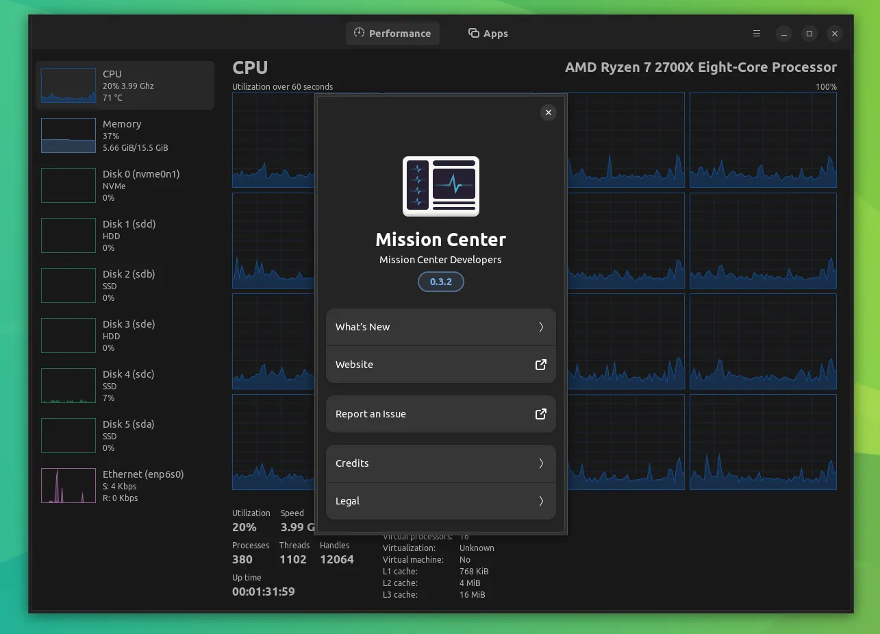 主要使用 内存安全的 Rust 编程语言 编写的 任务中心 是一款可以让你监控 CPU、内存、磁盘、网络以及 GPU 的系统监控器。