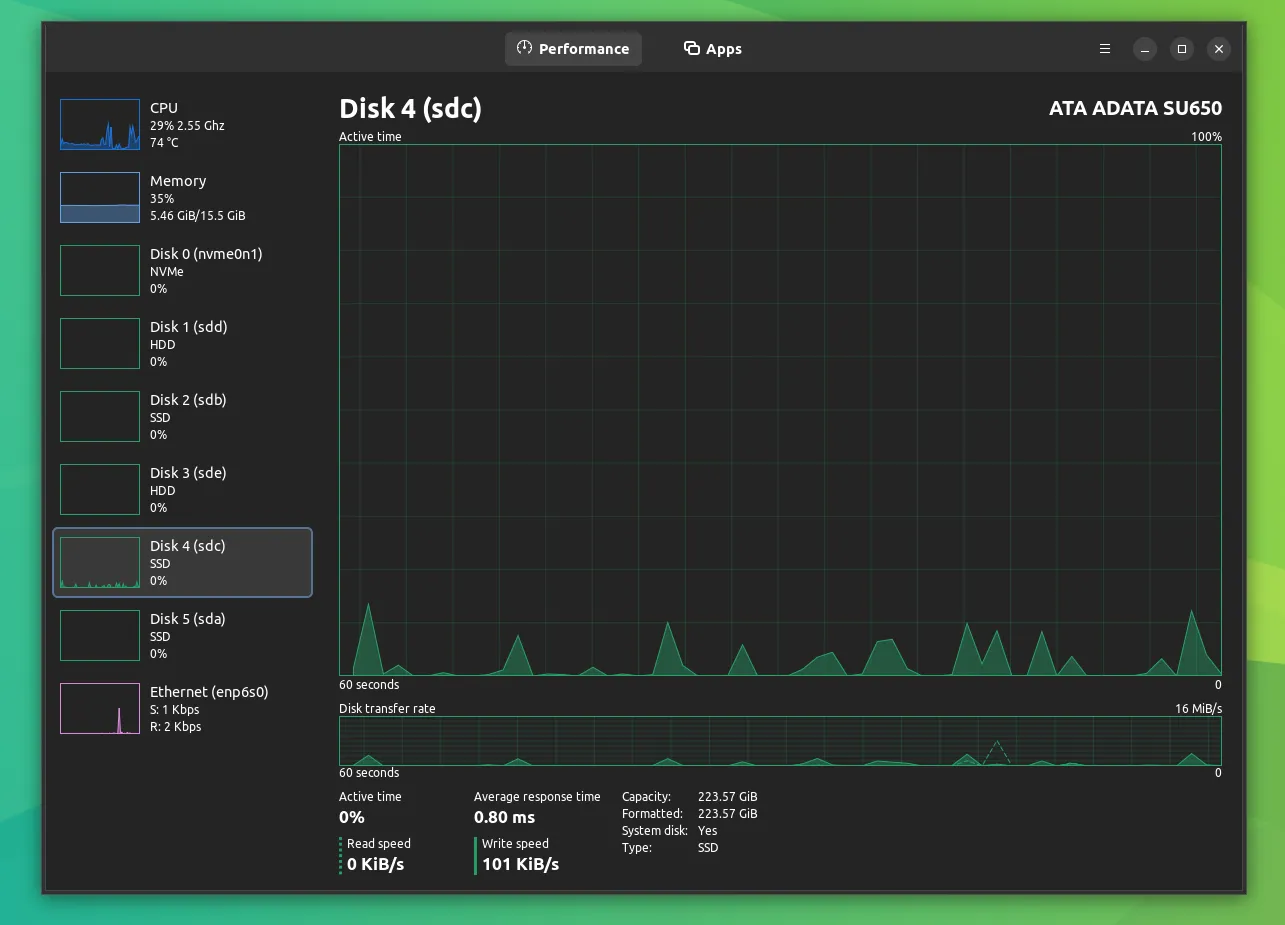 然后我查看了 “ 硬盘 ” 标签。即便我在我的系统中有多个存储硬盘,但我只在 Ubuntu 上使用了 “Disk 4”。我对其进行了使用率检查,显示出来的似乎是实时的磁盘使用数据。