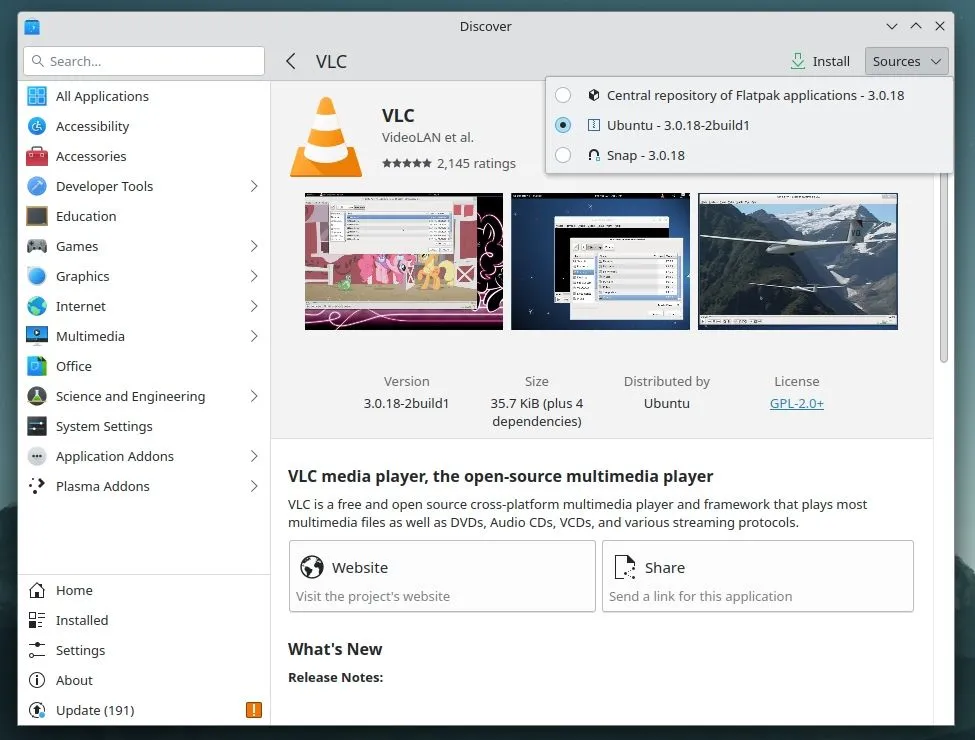 提及 Kubuntu,你得到的软件管理器是 “ 发现 ” 应用。你也可以从软件仓库以及 Snap 包中安装应用。