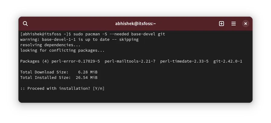 安装所需的 base-devel(包含 makepkg 等工具)和 git(克隆 yay 的 Git 仓库所需的)。