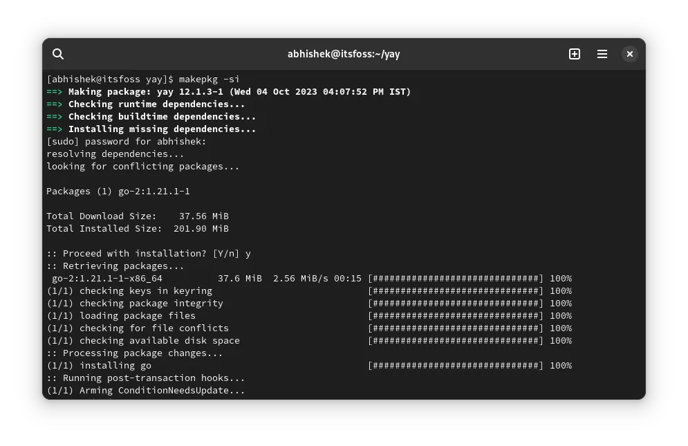现在你已经有了所需的软件包,是时候在你的系统上安装 Yay。