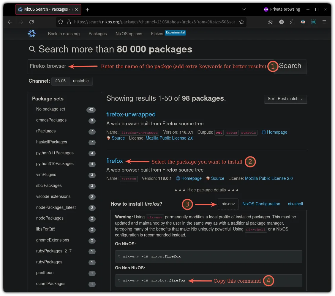 首先,访问 Nix 搜索的官方页面 并输入你要安装的软件包的名称。