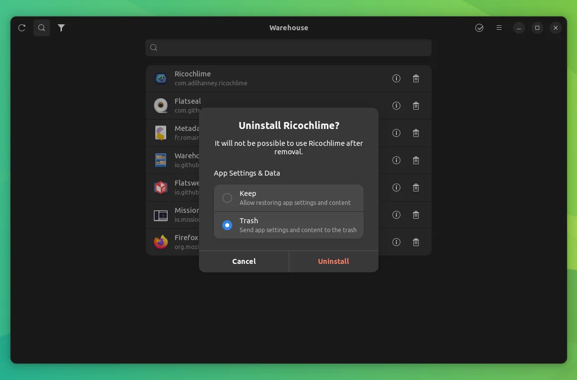 类似地,我可以点击“垃圾桶”图标,要么完全卸载 Flatpak 应用,要么为将来重新安装保留用户数据,并恢复设置/内容。