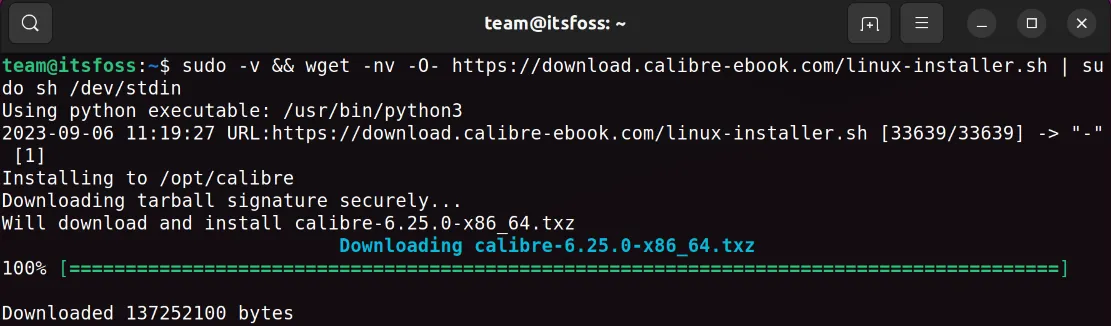 sudo -v && wget -nv -O- https://download.calibre-ebook.com/linux-installer.sh | sudo sh /dev/stdin