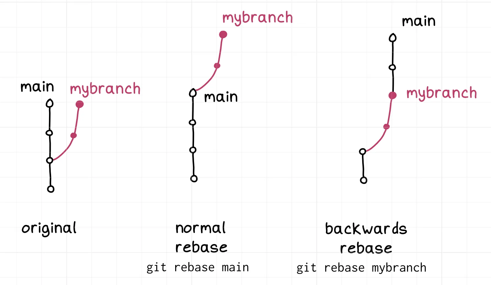 Git 将会欣然允许你进行任一操作,尽管在这个案例中 git rebase main 是极其正常的,而 git rebase mybranch 则显得格外奇怪。许多人表示他们对此感到困惑,所以我提供了一个展示两种变基类型的图片以供参考: