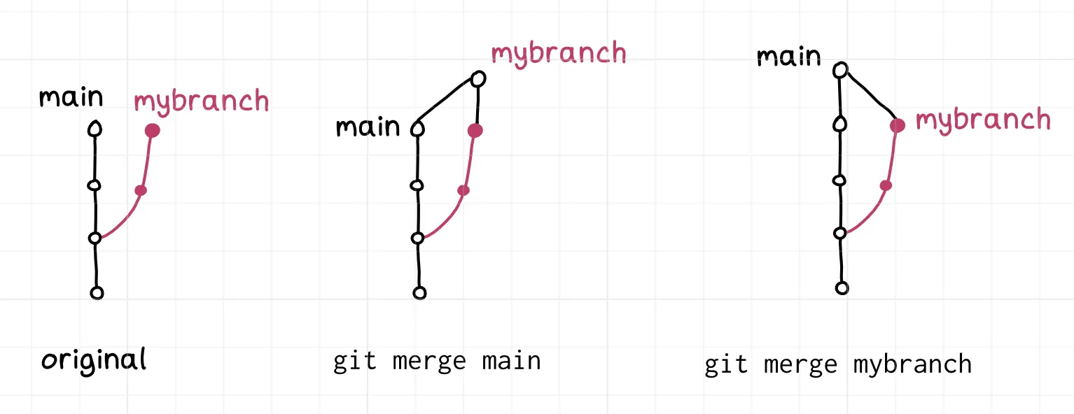 相似地,你可以进行“反向”的合并,尽管这相较于反向变基要正常得多——将 mybranch 合并到 main 和将 main 合并到 mybranch 都有各自的益处。