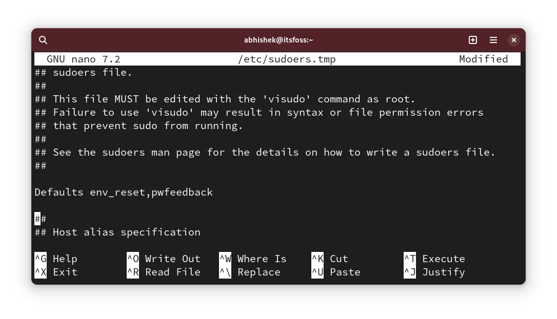 传统上,visudo 命令会在 Vi 编辑器中打开 /etc/sudoers 文件。如果你用的是 Ubuntu,那么会在 Nano 中打开。