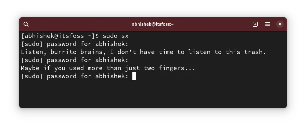 这个小技巧就是,在你每次输错密码时,让 sudo 抛出随机的“侮辱”